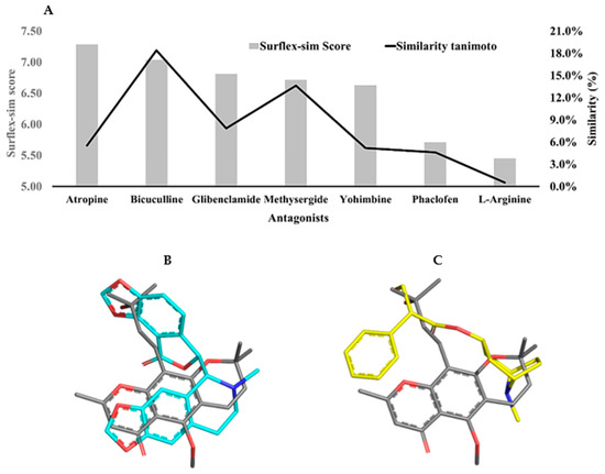 Topological descriptors (fingerprints) were employed to evaluate the chemical similarity between 5-CK and several antagonists of receptors and ion channels related to endogenous analgesia pathways (Supplementary Materials Figure S1), namely methysergide maleate (serotonergic receptor antagonist); yohimbine (alpha-2 adrenergic receptor antagonist); atropine (cholinergic receptor antagonist); bicuculline (gamma aminobutyric acid-A—GABAA receptor antagonist); phaclofen (gamma aminobutyric acid-B—GABAB receptor antagonist); L-arginine (precursor of nitric oxide); glibenclamide (ATP-sensitive potassium channel blocker). In general, the Tanimoto coefficients are quite low (<20%) and suggest that 5-CK’s target cannot be identified by this method. On the other hand, morphological analysis, which is a 3D method, suggests that 5-CK has a significant morphological similarity to atropine (7.28), bicuculline (7.03), and glibenclamide (6.81) (Figure 5A). Although 5-CK has a higher Surflex-sim score for atropine than bicuculline, a visual analysis suggests that 5-CK is better aligned with bicuculline (Figure 5B,C).