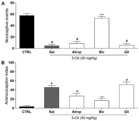 Assessment of possible mechanisms involved in the antinociceptive effect of 5-CK. Functional antagonism assays were performed on cold plate; and (A) tail flick; (B) tests using atropine (Atrop; 10 mg/Kg, 15 min before, cholinergic receptor antagonist), bicuculline (Bic; 1 mg/Kg, 15 min before, GABAA receptor antagonist) or glibenclamide (Gli; ATP-sensitive potassium channel blocker, 2 mg/Kg, 30 min before). Mice were treated by intraperitoneal routes with antagonists or saline (Sal) before the administration of 5-CK (50 mg/Kg) and 40 min afterward were submitted to nociceptive tests. The control group (CTRL) was treated with vehicle (50% propylene glycol in saline) by intraperitoneal route 40 min before the test. Data are expressed as means ± SEM; n = 6 mice per group. # Significantly different from CTRL group (p < 0.05). *** Significantly different from Sal group (p < 0.001). One-way ANOVA followed by Tukey’s test.