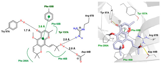 According to docking results, 2-methylchromone moiety performs a π-π-stacking interaction to Phe65B (3.6 Å). Additional hydrophobic interactions of this moiety, along with dihydro-2H-pyran ring are found with Try157A, Phe46B, Phe65B, and Phe200B. The carbonyl group hydrogen-bonds to Try97A, whereas the 2-penten-4-ol moiety interacts with Arg67B and Asp44B which, to our knowledge, have not been explored in experimental studies.