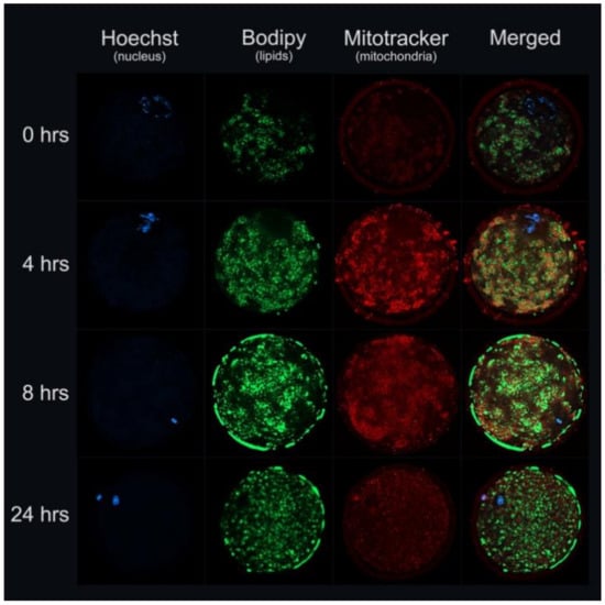 Recently, we showed that the lipid content of Bos taurus oocytes increased in the first 4 h and remained similar until 24 h during IVM [38]. In Figure 1, we illustrate bovine oocytes during in vitro maturation (0, 4, 8, and 24 h of maturation) demonstrating meiotic maturation, lipid content, and mitochondrial activity.