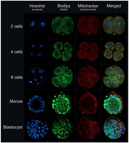 Recently, we showed that blastocysts generated from earlier embryo cleavage exhibit higher lipid content than later embryo cleavage [85]. Additionally, another group showed that the lipid profile, especially of phosphatidylcholines, was different between fast- and slow-growing embryos at the 8–16 cell stage. Moreover, IVD blastocysts exhibit a different lipid profile to IVP blastocysts, but unlike the other group, no differences in the lipid profile of fast-and slow-growing IVP blastocysts were observed [57]. These findings indicate that the lipid content and profile of the embryo are correlated with its quality, but the underlying biological mechanisms are yet to be well understood. In Figure 2, we illustrate bovine embryos during in vitro cultivation (2, 4, and 8 cells, morula and blastocyst) demonstrating DNA, lipid content, and mitochondrial activity.