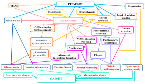 The suggested mechanisms involved in increased CAD/HF risk in patients with PTDM/diabetes mellitus. RAAS—renin-angiotensin-aldosterone system; eNOS—endothelial nitric synthase; NO—nitric oxide; VSMC—vascular smooth muscle cells; CAD—cardiovascular disease; HF—heart failure.