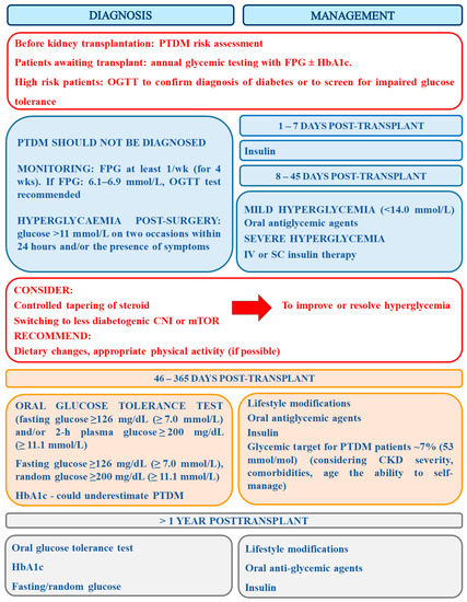 According to the prepared but not yet accepted Guidelines On The Detection And Management Of Diabetes Post Solid Organ Transplantation Detection of Association of British Clinical Diabetologist and Renal Association, the diagnosis of PTDM should be avoided in the immediate post-operative period when transient hyperglycemia is extremely common (Grade 1B) and thus a formal diagnosis can be made from 6-weeks post-transplantation (Grade 1B) [114]. The identification of patients with post-operative hyperglycemia should be made with the use of afternoon capillary blood glucose monitoring (AGM) and such patients ought to be closely monitored for PTDM (Grade 1B). Currently, oral glucose tolerance test is the gold standard for the diagnosis of PTDM, and HbA1c ≥6.5% (48 mmol/L) is a proper diagnostic test in clinically stable solid organ transplant recipients after the first 3 months post-transplantation (grade 1B). However, the results of the latter test should be used with caution since some factors may impair its accurate interpretation (Grade 1A). Results of abnormal fasting plasma glucose (FPG) ≥7 mmol/L and/or HbA1c >6.5% (48 mmol/mol) allows for the identification of the majority of PTDM cases in stable patients (Grade 2C). Patients awaiting transplant ought to receive annual glycemic testing with FPG ± HbA1c. Those at high risk patients should then undergo OGTT to confirm diagnosis of diabetes or to screen for impaired glucose tolerance (Grade 2C). The new guidelines do not recommend the use of novel diagnostic tools (e.g., fructosamine and glycated albumin) as clinical tools (Grade 2D). After transplantation, early postoperative hyperglycemia (glucose >11 mmol/L on two occasions within 24 h) should be straightaway actively monitored and treated with oral hyperglycemic therapy if it is mild (<14.0 mmol/L), or with early intravenous or subcutaneous insulin therapy in more severe cases (Grade 1C). Glycemic target for patients with PTDM should be established at c.a. 7% (53 mmol/mol), however, while setting the target the severity of CKD, comorbidities, age and the ability to self-manage ought to be taken into consideration (Grade 1B). Patients with a confirmed diagnosis of PTDM should be offered structured diabetes education as well as structured diabetes care, involving regular screening for complications (Grade 1B). Additionally, blood pressure should be controlled below 130/80 mmHg in all patients with PTDM (Grade 1B) [114].