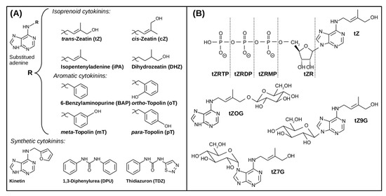 Figure 1. Structures of major cytokinins (CKs) in form of free bases (A) and different forms of trans-zeatin (B). Taken from [32]; tZR: trans-zeatin riboside; tZRMP: trans-zeatin riboside monophosphate; tZRDP: trans-zeatin riboside diphosphate; tZRTP: trans-zeatin riboside triphosphate; tZOG: trans-zeatin O-glucoside; tZ7G: trans-zeatin N7-glucoside; tZ9G: trans-zeatin N9-glucoside. Remaining abbreviations are explained in the figure.