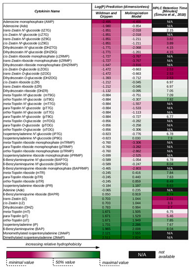 Figure 2. Hydrophobicity of various cytokinin species (CK) has been predicted using cheminformatics tools. In the second column, log(P) values are estimated according to [54]; this method yields log(P) as a sum of individual Wildman-Crippen atomic contributions. Calculation of Wildman-Crippen contributions has been done using RDKit: Open-source cheminformatics software (http://www.rdkit.org, accessed on 4 January 2021). In the third column, log(P) values are estimated using a method provided by Molinspiration Cheminformatics free web services (https://www.molinspiration.com, accessed on 4 January 2021). To compare these predictions with actual experimental data, retention times of internal standards for high-performance liquid chromatography (HPLC) separation of CKs taken from [55] are given in the last column. For all three datasets, relative hydrophobicity range is visualized using the colour scale given below the table. The colour range is normalized within each column. Note that not all of the listed CKs were analysed in [55], as indicated by missing values (“N/A”).