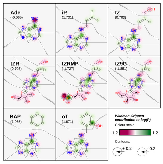 Figure 3. For selected CKs, Wildman-Crippen contributions of individual atoms to the value of log(P) have been predicted according to [54]. Gaussian distribution of the contributions have been visualized and juxtaposed with the corresponding molecular structures. Negative contributions (which decrease the overall hydrophobicity of the molecule) are depicted in shades of pink, while positive contributions (which increase the overall hydrophobicity) are depicted in shades of green (refer to the colour-bar in the bottom right corner of the figure). Increments of Wildman-Crippen contribution levels are also expressed by solid (above zero levels) and dashed contours (below zero levels). For each molecule, the Wildman-Crippen value of log(P) is given in the parentheses. Note that contributions of hydrogen atoms, which have been included in predicting total log(P) values, are not shown. Calculation and visualization of the Wildman-Crippen contributions have been performed using RDKit: Open-source cheminformatics software (http://www.rdkit.org, accessed on 4 January 2021). Ade: adenine; iP: isopentenyl adenine; tZ: trans-zeatin; tZR: trans-zeatin riboside; tZRMP: trans-zeatin riboside monophosphate; tZ9G: trans-zeatin N9-glucoside; BAP: 6-benzylaminopurine; oT: ortho-topolin; P—octanol-water partition coefficient.