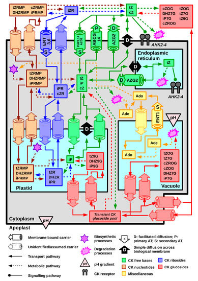 A comprehensive study of CK distribution in Arabidopsis (a dicot) and barley (a monocot) leaf cells was carried out by Jiskrová et al. [70]. In Arabidopsis, tZ was mostly extracellular, with a small fraction localized in cytoplasm, similarly to tZR and tZ-type glucosides; tZRMP was found in the cytoplasm as well. iP and iPR were predominantly localized in the cytoplasm, while most of iPRMP was found in the extracellular space. The iP-type glucosides were found in both the extracellular space and vacuoles. cZ was extracellular, cZR intracellular, cZRMP was found in both extracellular space and cytoplasm, and cZ-type glucosides were localized in the extracellular space and vacuoles. Of DHZ-type CKs, only DHZ7G was detected in a significant amount; it was localized in the extracellular space and vacuoles. In barley, apoplast was dominated by tZ9G and cZOG with a noticeable presence of the active bases iP and tZ as well as iPRMP. In contrast to Arabidopsis, vacuolar content was enriched in iP and cytoplasmic content in iPR. cZ forms made up for over 60% of both the cytoplasmic and the vacuolar cytokinins content in barley [70].