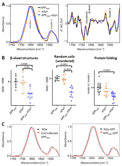 First, we studied the effect of mutated αSyn (A53T) on Aβ aggregation (Figure 2). The A53T mutation promotes the formation of αSyn fibrils in vitro, leading to a Parkinson’s disease-like pathology [47]. Our data showed that the presence of Aβ and αSyn in N2a- APPSWE-αSyn cells led to a significantly reduced level of β-sheet structures compared to in monogenic N2a-APPSWE cells and N2a cells expressing human αSyn (N2a-αSyn). This decrease was accompanied by a significant reduction in random coils (unordered) structures and changes in total protein folding (Figure 2B), indicating a possible reduction in aggregate toxicity via reduced protein folding. We observed an effect of GFP on β-sheet structures (Figure 2C); therefore, to consider the contribution of GFP in the structural analysis, N2a-APPSWE cells transfected with GFP only (APPSWE) were used as a control.