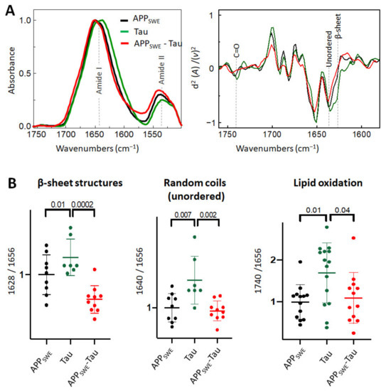 As a next step, we studied Aβ aggregation in the presence of Tau containing the P301L mutation (Figure 3). Immunofluorescence data (Figure 1C) combined with FTIR analysis showed that the presence of Tau reduced the average size of Aβ aggregates without a significant change to the β-sheet structural load (Figure 3B). Interestingly, in N2a cells expressing Tau alone (N2a-Tau), the levels of β-sheet load, random coils structures, and lipid oxidation were significantly increased compared to Aβ-expressing cells (N2a-APPSWE and N2a-APPSWE-Tau cells).