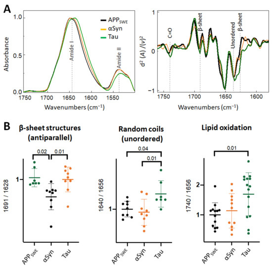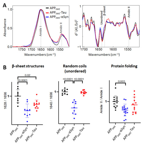 Comparison of structural changes in protein aggregates in the bigenic models of AD protein aggregation. (A) Averaged and normalized infrared absorbance spectra and corresponding normalized second derivatives of N2a-APPSWE, N2a-APPSWE-αSyn, and N2a-APPSWE-Tau, models of mixed protein aggregation. Numbers in parentheses indicate corresponding graphs with statistical analysis. Dashed lines indicate peak positions. (B) Statistical analysis of structural changes: one-way ANOVA (p < 0.01) ± s.d. All values were normalized to the control, N2a-APPSWE cells. One dot corresponds to a single cell, n = 7–20 cells per independent measurement reproduced at least twice.