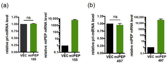 In plants, it was initially shown for two miPEPs that they enhance the transcription of their own pri-miRNAs [7], a concept further extended to other miRNA genes and in various plant species [8,10]. So far in humans, only miPEP133 has been shown to promote such a positive autoregulatory loop [16]. To determine whether this is a general mechanism, we investigated the potential regulatory role of miPEP155 and miPEP497 on the expression of their pri-miRNAs. Hela cells were transfected with either the control vector (VEC) or the miPEP expression constructs, and the levels of endogenous pri-miR-155 and pri-miR-497 were quantified 48 h post-transfection by quantitative RT-PCR. Results show that, while we detected the expression of miPEPs constructs at the RNA levels (Figure 2a,b, right panels), there was no change in endogenous pri-miR-155 (Figure 2a, left panel) or pri-miR-497 (Figure 2b, left panel) levels upon overexpression of miPEP155 or miPEP497, respectively.