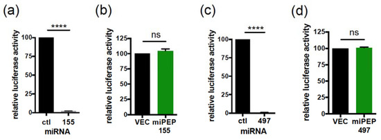 We next questioned a possible regulatory role of miPEPs on the activity of their endogenous associated mature miRNAs. To do this, we constructed sensors of miR-155 and miR-497 activity obtained by cloning a miR-155 or miR-497 synthetic target into a dual luciferase reporter vector. Co-transfection of the miR-155 or miR-497 luciferase reporters together with a control miRNA or their corresponding miRNAs into Hela cells showed a significant reduction in luciferase activities with the miRNAs relative to control miRNA (Figure 3a,c), even at low concentration of miRNA (Figure S3a,b), validating the sensitivity of our miRNA sensors. Co-transfection of Hela cells with miR-155 sensor together with an anti-miRNA control or with an anti-miR-155 inhibitor able to rescue the overexpression of miR-155 (Figure S4a) revealed that endogenous miR-155 is active in Hela cells (Figure S4c). Similar experiments performed with the anti-miR-497 inhibitor revealed a weaker but significant detectable activity of endogenous miR-497 in Hela cells (Figure S4b,d), in agreement with a previous report [21]. However, co-transfection of miR-155 or miR-497 luciferase reporters together with a control vector or miPEP expression constructs showed that overexpression of miPEP155 or miPEP497 did not affect endogenous miR-155 (Figure 3b) or miR-497 (Figure 3d) activities, respectively.