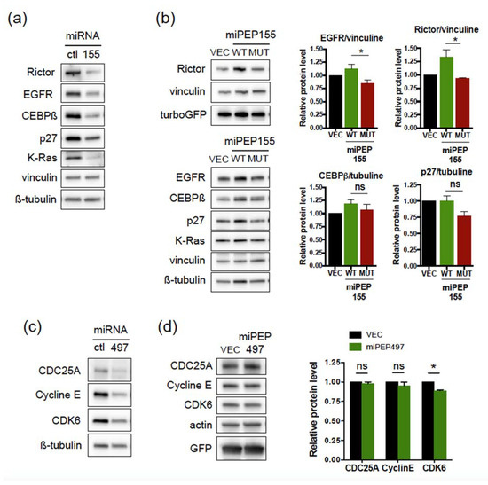 Analysis of the expression of miR-155 and miR-497 target genes supported these data. Overexpression of miR-155 in Hela cells led to a downregulation of Rictor, EGFR, CEBPß, K-Ras, and p27 (Figure 4a), as expected [22,23,24,25], even at low concentration of miR-155 (Figure S5a). On the other hand, overexpression of miPEP155 did not induce a decrease in the expression of miR-155 targets (Figure 4b), confirming the results obtained above. In fact, we observed an increased expression of Rictor and EGFR upon overexpression of WT miPEP155 when compared to mutant miPEP155 (Figure 4b). Similarly, while overexpression of miR-497 led to downregulation of genes encoding cell cycle activators, as expected [26,27], such as CDC25A, CDK6, and Cyclin E (Figure 4c), overexpression of miPEP497 had no effect on CDC25A and Cyclin E levels, although a slight decrease in CDK6 levels was observed (Figure 4d). Thus, these results indicate that miPEP155 and miPEP497 do not regulate the levels of their own pri-miRNAs and consequently the activity of the processed miRNAs.