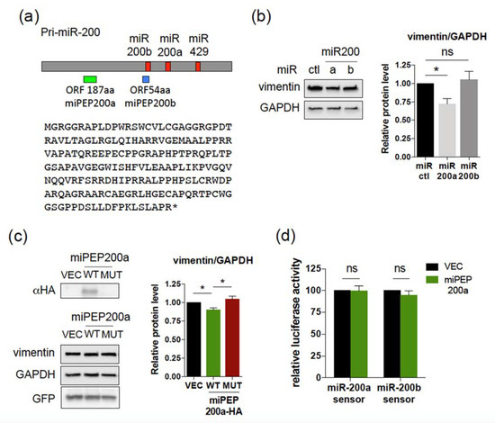 Recently, two sORFs have been identified within the human pri-miRNA of miR-200a and miR-200b, a 187 amino acid ORF (coding miPEP200a) and a 54 amino acid ORF (coding miPEP200b), and overexpression of these HA-tagged-miPEPs in PC3 prostate cancer cells inhibited their migration and downregulated the vimentin expression [12]. Since miR-200a and miR-200b also regulate cell migration [13], it was suggested that the miPEPs200 might function by activating miR-200a and miR-200b. To investigate this point, and according to the schematic structure described in Fang et al., (2017), we identified a 187 amino acid peptide encoded by a sORF of 564 nt located in the 5′ part of pri-miR-200 (Figure 5a), likely corresponding to miPEP200a. Overexpression of miR-200a or miR-200b in PC3 cells revealed that only miR-200a was able to downregulate vimentin expression (Figure 5b). Overexpression of miPEP200a in PC3 cells slightly decreases vimentin expression (Figure 5c). However, co-transfection of the miR-200a or miR-200b luciferase reporters together with a control vector or the miPEP200a expression construct showed that miPEP200a overexpression did not change endogenous miR-200a or miR-200b activities (Figure 5d). On the other hand, co-transfection of the miR-200a or miR-200b luciferase reporters together with a control miRNA or their corresponding miRNAs showed a strong reduction in luciferase activities with the miRNAs relative to control miRNA, validating our miRNA sensors (Figure S3c,d). These results suggest that miPEP200a downregulates vimentin expression independently of the miR200a and miR200b activation.