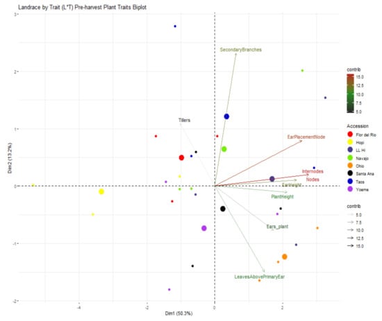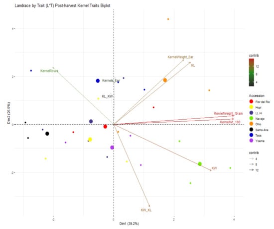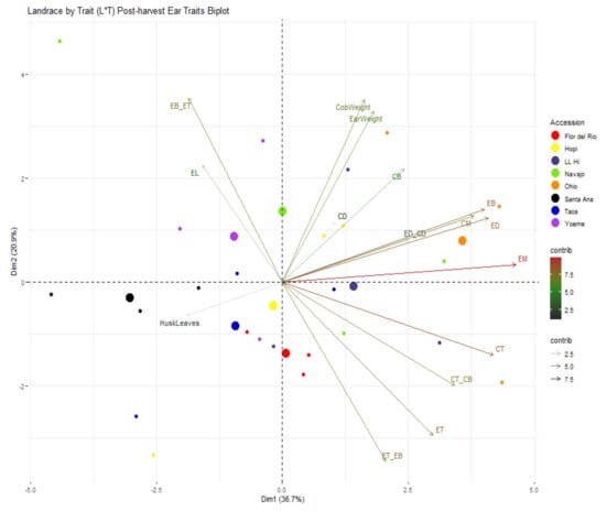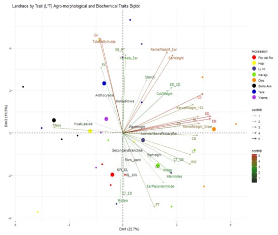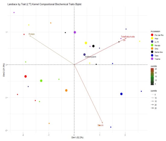 24] was based on 27 distinct groups of 123 pigmented maize landraces and a total of four groups were formed using PCA based on the ear length and shank size. Our results were based on a broader scale including the evaluation of pre-harvest phenotypic characters, post-harvest morphological traits, and kernel biochemical traits. Based on the PCA, Corn Belt Dent Ohio Blue was readily distinguished from the southwestern landraces.