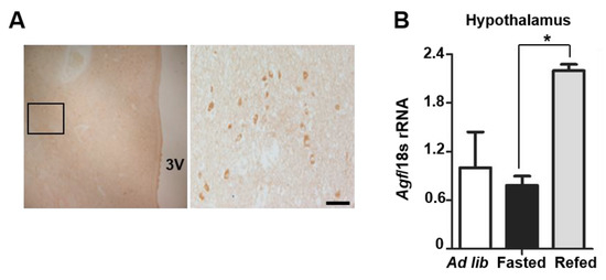 Angiopoietin-like growth factor (AGF) is expressed in the hypothalamus. (A) Immunohistochemical detection of AGF in the human brain. The boxed area within the image indicates a magnified field. (B) Agf mRNA expression in the hypothalamus of ad libitum-fed, overnight fasted or refed mice, confirmed by qPCR analysis (n = 5/group). Data represent means ± SEM (* p < 0.05). Scale bars: 50 μm.