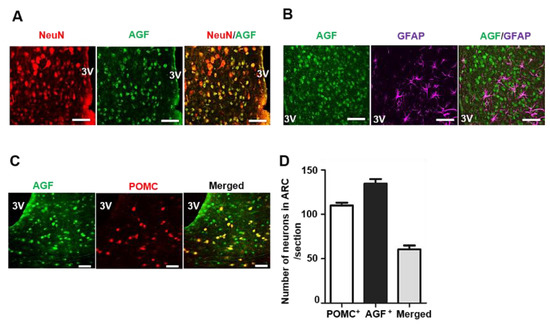AGF is colocalized to proopiomelanocortin (POMC) neurons rather than glial fibrillary acidic protein (GFAP)-positive cells in the hypothalamus. (A,B) Immunofluorescence staining of AGF (green) and NeuN (red), a neuronal nuclei marker and GFAP (magenta), an astrocyte marker in the hypothalamus section. (C) POMC neurons in the hypothalamus, detected based on red fluorescence in POMC-specific tandem dimer Tomato (tdTomato) expressing reporter mice, and AGF immunofluorescence staining. Brain slices were prepared by cryosectioning (25 μm/section). Sections were incubated overnight at 4 °C with Alexa 488-conjugated mouse anti-AGF antibody (1:100). Fluorescence was visualized by confocal microscopy. A yellow-colored neuron represents the colocalization of AGF with POMC. (D) Number of AGF and POMC double-positive neurons in the ARC (between −1.7 and −3.4 mm from bregma) presented as means ± SD (n = 10/slide). Scale bars: 50 μm (upper).