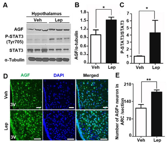 AGF expression is induced by leptin-stimulated signal transducer and activator of transcription 3 (STAT3) activation. (A) AGF level in the hypothalamus of C57BL/6 mice after intraperitoneal injection of recombinant mouse leptin (3 mg/kg) or vehicle, determined by Western blotting. AGF, pSTAT3 (Tyr705), STAT3 and α-tubulin were detected in tissue lysates containing equal amounts of protein from the hypothalamus of each group. (B,C) Band intensities of AGF and pSTAT3 measured by the ImageJ program; values are normalized to vehicle-injected samples. (D) AGF and DAPI (4′,6-diamidino-2-phenylindole) co-staining in brain sections from leptin- or vehicle-injected mice. Immunoreactivity was detected by confocal microscopy. (E) Number of AGF-positive neurons in the ARC. Data represent means ± SEM (* p < 0.05, ** p < 0.01).