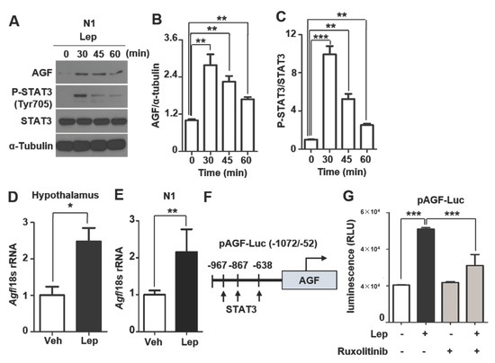 Consistent with in vivo experiments, both AGF and pSTAT3 expression were increased after leptin treatment in N1 cells (Figure 4A–C). We further found that AGF mRNA level was 2.5-fold higher in the hypothalamus of leptin-injected mice (Figure 4D) and 2-fold higher in leptin-treated N1 cells compared with vehicle-treated controls (Figure 4E), suggesting that leptin induces AGF transcription. To test this, we first sought to identify transcription factor binding sites in the AGF promoter using an online search program (http://tfbind.hgc.jp/ accessed on 23 May 2020), which predicted three consensus STAT3 binding sequences in a 1020-bp (−1072 to −52 bp) 5′ untranslated region (Figure 4F). Using a promoter-reporter construct in which this 1020-bp region was placed upstream of the luciferase gene, we tested whether the promoter activity of AGF was affected by leptin treatment. In N1 cells transfected with this promoter-reporter construct, leptin (100 ng/ml) induced a 2.6-fold increase in reporter activity within 45 min (Figure 4G). Notably, induction of AGF promoter activity by exogenous leptin treatment was ablated by a 1 h pre-incubation with ruxolitinib (1 μM), a leptin signaling inhibitor that blocks JAK2-mediated phosphorylation (Figure 4G). These results indicate that AGF transcription is induced by leptin and mediated by phospho-STAT3, a downstream of leptin/JAK2 signaling.