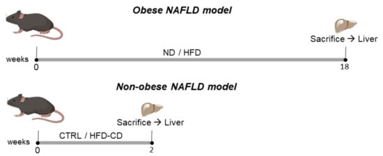 We engaged two NAFLD models in non-aged mice. Specifically, young adult mice were subjected to two different dietary models of NAFLD which differed in the presence of obesity. The first NAFLD model was based on diet-induced obesity resulting from feeding on a high-fat diet (HFD) for 18 weeks. In the second, non-obese NAFLD model, mice were fed a high-fat, choline-deficient, low-methionine diet (HFD-CD) for 2 weeks [,] (Figure 1).