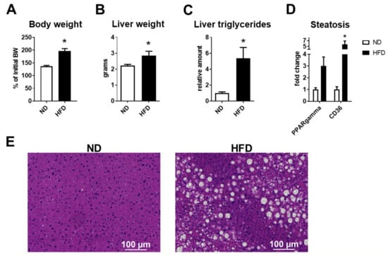 Development of liver steatosis in the model of HFD-induced NAFLD. (A) Body weight of mice fed an ND or an HFD is shown. Data are presented as percentages of the initial body weight. (B) Liver weight of ND- and HFD-fed mice is shown. (C) The triglyceride levels in hepatic tissue homogenates from ND- and HFD-fed mice were quantified. The triglyceride amounts (μmol of triglycerides per gram of tissue) are expressed relative to those of ND mice, which were set as 1. (D) The mRNA expression of steatosis-related genes (peroxisome proliferator-activated receptor gamma, PPAR-gamma, CD36) in livers from ND- and HFD-fed mice was evaluated by qPCR. Eukaryotic translation elongation factor 2 (ETEF2) was used for normalization of mRNA expression, and the expression of each gene in the control group (ND) was set as 1. (E) Representative images of hematoxylin–eosin staining in liver sections of ND- or HFD-fed mice. Data are presented as mean ± SEM (n = 8/group); * p < 0.05.