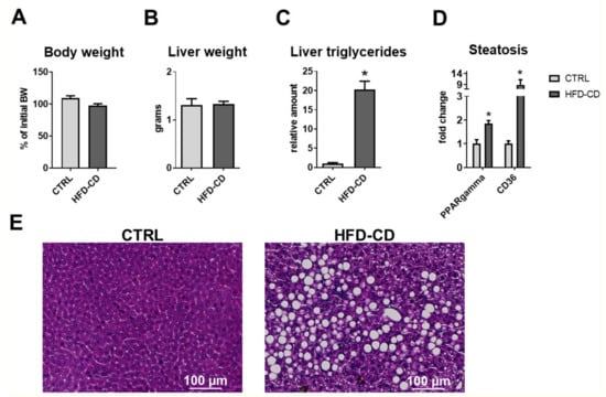 Development of liver steatosis in the model of HFD-CD-induced NAFLD. (A) Body weight of mice fed a CTRL or an HFD-CD diet is shown. Data are presented as percentages of the initial body weight. (B) Liver weight of CTRL- and HFD-CD-fed mice. (C) The triglyceride levels in hepatic tissue homogenate from CTRL- and HFD-CD-fed mice were measured. The triglyceride amounts (μmol of triglycerides per gram of tissue) are expressed relative to those of CTRL mice, which were set as 1. (D) The mRNA expression of genes related to hepatic fat accumulation (PPAR-gamma, CD36) in livers from CTRL and HFD-CD mice was evaluated by qPCR. ETEF2 was used for normalization of mRNA expression, and the expression of each gene in the control group (CTRL) was set as 1. (E) Representative images of hematoxylin–eosin staining in livers from CTRL- and HFD-CD-fed mice. Data are presented as mean ± SEM (n = 4–5/group); * p < 0.05.