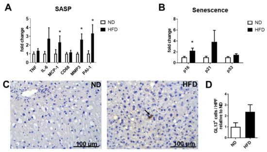 Senescence in the livers of mice of the HFD-induced model of NAFLD. (A,B) The mRNA expression of senescence-associated secretory phenotype (SASP)-related genes (A) or senescence-related genes (B) was assessed by qPCR in livers from ND- and HFD-fed mice. ETEF2 was used for normalization of mRNA expression, and the expression of each gene in the ND group was set as 1. (C) Representative images of GL13 staining indicating senescence in livers of ND- and HFD-fed mice are shown. Arrow indicates a GL13-positive cell. (D) The number of GL13-positive cells per high-power field (HPF), as shown in (C), was evaluated and data are displayed as relative to the cells/HPF of the ND group. Data are presented as mean ± SEM (n = 7–8/group); * p < 0.05.