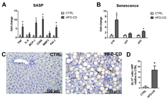In the non-obese HFD-CD feeding model, several SASP-related genes, including genes encoding for Tumor Necrosis Factor (TNF), MCP-1, CD68, and PAI-1, as well as the senescence-related genes p16 and p53 displayed increased mRNA expression in the livers of the HFD-CD group as compared to control mice; see Figure 5A,B. Consistently, immunohistochemistry for GL13 showed that senescent cells in the livers of the HFD-CD group were much more abundant compared to those of the respective control group (Figure 5C,D).