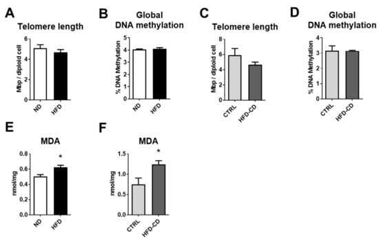 NAFLD in non-aged mice is characterized by stress-induced senescence. (A) Total telomere length per diploid cell was evaluated in hepatic tissue of ND- and HFD-fed mice as described in the experimental procedures. (B) The percentage of global DNA methylation in DNA isolated from livers of ND and HFD mice is shown. (C) Total telomere length per diploid cell was evaluated in livers from CTRL and HFD-CD mice. (D) The percentage of global DNA methylation in DNA isolated from livers of CTRL and HFD-CD mice is shown. (E,F) The amount of malondialdehyde (MDA), as an indicator of oxidative stress, in the livers from ND and HFD mice (shown in E) or CTRL and HFD-CD mice (shown in F) is shown. In (A,B,E), n = 7–8/group; in (C,D,F), n = 4–5/group. Data are mean ± SEM; * p < 0.05.