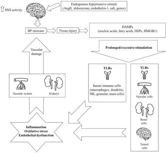 The involvement of TLRs in the crosstalk between CNS inflammation and BP elevation has been also demonstrated in hypertensive models of exogenous AngII administration. More specifically, in a study by Ding et al., sustained AngII infusion into CNS caused a notable upregulation and activation of TLR4, followed by an excess immune-mediated inflammatory response including enhanced microglial activation and ROS production. Subsequently, sustained BP elevation was observed. Of interest, the overall effect was more pronounced in mice expressing the lectin-like oxidized low-density lipoprotein scavenger receptor-1 which has been linked to TLR4 activation, thereby reinforcing the observation that a TLR4 signaling pathway can mediate inflammatory responses in the brain linked to sympathoexcitation [27]. Likewise, in another study by Dange et al., AngII-induced hypertensive rats exhibited a dramatic upregulation of TLR4 within the PVN associated with a significant production of pro-inflammatory cytokines and a marked increase in plasma circulating NE and MBP. Furthermore, noticeable cardiac hypertrophy and impairment of cardiac diastolic function were observed. On the contrary, the blockade of TLR4 had a contrasting effect on AngII-mediated actions in favor of vasodilation, as indicated by significantly reduced plasma NE levels and MBP. In addition, delayed progression of target organ damage was observed, as evidenced by a reduction in cardiac hypertrophy and improvement of cardiac diastolic dysfunction [28].