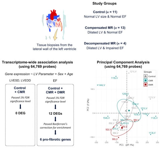 Patients with primary mitral regurgitation (MR) may remain asymptomatic for many years. For unknown reasons, some shift from a compensated to a decompensated state and progress to fatal heart failure. To elucidate the genetic determinants of this process, we recruited 28 patients who underwent mitral valve surgery and stratified them into control, compensated MR, and decompensated MR groups. Tissue biopsies were obtained from the patients’ left ventricular (LV) lateral wall for a transcriptome-wide profiling of 64,769 probes to identify differentially expressed genes (DEGs). Using cutoff values at the 1% FDR significance level and sex- and age-adjusted regression models, we identified 12 significant DEGs (CTGF, MAP1B, SERPINE1, MYH9, MICAL2, MYO1D, CRY1, AQP7P3, HTRA1, PRSS23, IGFBP2, and FN1). The most significant gene was CTGF (adjusted R2 = 0.74, p = 1.80 × 10−8). We found that the majority of genes expressed in the more advanced decompensated MR group were pro-fibrotic genes associated with cardiac fibrosis. In particular, six pro-fibrotic genes (CTGF, SERPINE1, MYH9, HTRA1, PRSS23, and FN1) were overexpressed and enriched in pathways involved in ECM (extracellular matrix) protein remodeling. Therapeutic interventions that antagonize these six genes may slow the progression toward decompensated MR.