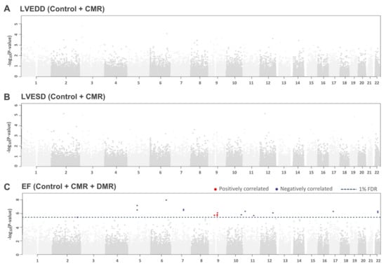 Transcriptome-wide association analysis. (A) LVEDD, (B) LVESD, (C) Ejection fraction. Each data point on the Manhattan plot corresponds to a TWAS result of −log10 of the p-value. The blue dashed line corresponds to the transcriptome-wide significance threshold for 1% FDR, and for ejection fraction, the significance threshold is at p = 3.56 × 10−6. Positive correlation probes are in red and negative correlation probes are in blue.