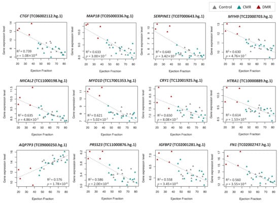 When using the LVEDD and LVESD parameters to compare gene expression changes in patients with normal and dilated LV, we did not find DEGs that passed the 1% FDR significance level (Figure 2A,B). However, after combining the three groups, 19 probes passed the 1% FDR significance level and were associated with reduced EF (Figure 2C). Four probes were positively correlated (i.e., positive β coefficients) and 15 probes were negatively correlated. Of these probes, 12 significant DEGs were located in the coding region of the transcribed genes, one of which was positively correlated with EF and the other 11 were negatively correlated with EF.