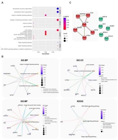Enriched GO terms and KEGG pathways for the 12 significant DEGs. (A) GO terms and pathways that passed Bonferroni correction p < 0.05 and q < 0.05. (B) Relationships between mRNA and GO terms in BP (biological process), CC (cellular component), MF (molecular function), and KEGG pathways; fold change are β coefficient correlation values (C) STRING network showing the highest interaction enrichment between CTGF, SERPINE1, FN1, PRSS23, HTRA1, and MYH9 genes (PPI enrichment p value 1.8 × 10−4).