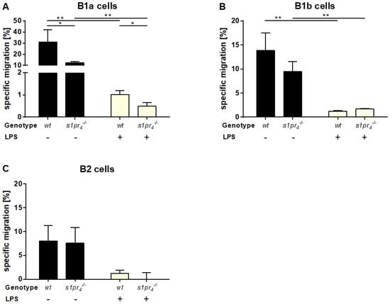 S1P has been shown to regulate peritoneal B cell migration via S1P1 and S1P4 [23]. To assess the functional consequences of activation-induced modification of S1PR expression on peritoneal B cells, the migration of these cells to an S1P gradient was tested in vitro. Since differential expression of S1P4 was observed in the peritoneal B cell subsets, these experiments were performed using wild type (wt) and S1P4-deficient (s1pr4−/−) mice. There was a significant reduction in S1P‑induced chemotactic response in wt B1a and B1b cells after previous LPS‑activation, while peritoneal B2 B cell migration remained unchanged before and after activation (Figure 2). In s1pr4−/− peritoneal B1a cells, migration to the S1P gradient was significantly lower than in wt B1a B cells, both with and without LPS‑induced activation. Finally, no differences in chemotactic behavior to S1P were observed between wt and s1pr4−/− cells could be observed in peritoneal B1b and B2 B cells at resting conditions and after LPS stimulation.