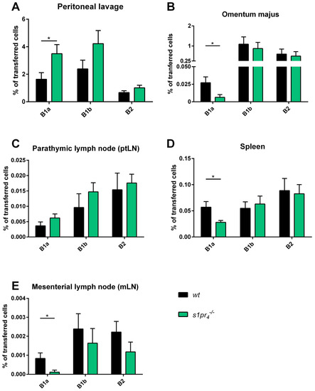 In vivo migration of intraperitoneal transferred peritoneal B cells after LPS stimulation. After the adoptive intraperitoneal transfer of labeled wt or s1pr4−/− peritoneal B cells into wt mice and 72 h of pulsed LPS treatment, the number of transferred cells was determined in the peritoneal cavity (A), the putative exit routes omentum (B), and parathymic lymph node (C), and the spleen (D) and mesenterial lymph node (E). Bars depict the mean values (+SEM) of total cell numbers for peritoneal B cell populations per organ (n = 10). * p < 0.05.