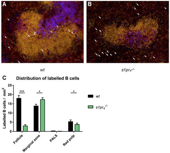 Localization of intraperitoneal transferred peritoneal B cells within the spleen after LPS stimulation in vivo. The localization of s1pr4−/− (A) and wt (B) i.p. transferred peritoneal B cells within the spleen was analyzed using fluorescence microscopy. Representative immunofluorescence-stained splenic sections from LPS-stimulated wt mice after adoptive cell transfer of wt or s1pr4−/− peritoneal cells (white bar equals 50 µm). The signal intensity of CFSE from labeled cells was enhanced using polyclonal anti-FITC-Alexa488 (green). Tissue sections were additionally stained with anti-B220 (yellow) and anti-CD4 (blue), while nuclei were stained with Draq5 (red). Transferred B cells were identified as B220+ CFSE+ (white arrows). (C) Quantification of the exact localization of transferred B cells within the different splenic and intestinal compartments (n = 10). (white scale bar equals 50 µm) * p < 0.05, *** p < 0.001.