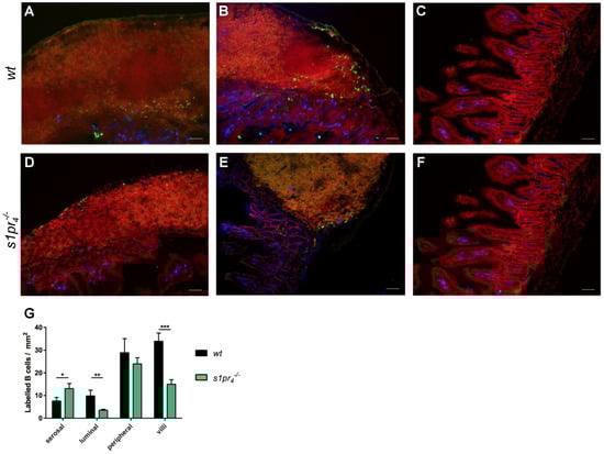 Localization of intraperitoneal transferred peritoneal B cells within Peyer’s patches after LPS stimulation in vivo. The signal intensity of CFSE from labeled cells was enhanced using polyclonal anti-FITC-Alexa488 (green). Tissue sections were additionally stained with anti-B220 (yellow) and anti-IgA (blue), while nuclei were stained with Draq5 (red) (white scale bar equals 50 µm). Transferred B cells were identified as B220+ CFSE+. While wt B cells resided on the luminal side (A) of the PPs below the SED, s1pr4−/− cells were found on the serosal side (D) of the PP. At the outer edge of the PPs, B cells of both genotypes were found in large numbers (wt: (B); s1pr4−/−: (E)). There were significantly more wt (C) than s1pr4−/− (F) B cells within the intestinal villi. The vast majority of transferred B cells in the small intestine were IgA-negative. (G) The number of transferred B cells within the compartments of PPs was quantified using QuPath for the downstream segmentation and classification of cells. * p < 0.05, ** p < 0.01, *** p < 0.001.