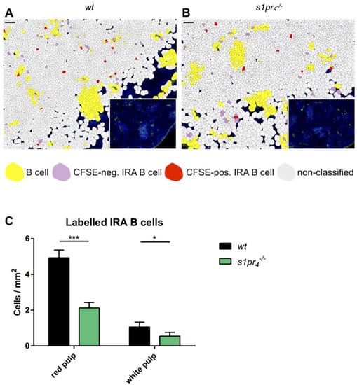 Analysis of the localization of splenic IRA B cells derived from transferred peritoneal B cells. After the adoptive cells of wt (A) and s1pr4−/− (B) peritoneal cells and subsequent LPS stimulation, spleen sections (3 µm) were stained with anti-B220 (green), anti-GM-CSF (red) and anti-FITC (white), while nuclei were stained with DAPI (blue) (black scale bar equals 50 µm). To improve visualization of spatial cell distribution, cell maps of the tissue sections (created using QuPath) are shown, with the original images displayed in the bottom corner. Cells were segmented based on DAPI staining and then classified according to their cytoplasmic staining. “B cells” were identified as B220+ CFSE− GM-CSF−, “CFSE-neg. IRA B cells” as B220+ CFSE− GM-CSF+ and “CFSE-pos. IRA B cells” as B220+ CFSE+ GM-CSF+. The remaining cells were designated as “non classified”. (C) Based on the aforementioned classification, the number of cells per mm2 was calculated and then compared between the genotypes. A total of 10 representative images in two sectional planes per animal were recorded as technical replicates, and their mean value was further used as a single biological replicate. Results shown are the mean values (+SEM) of these biological replicates for n = 10 animals per group. * p < 0.05, *** p < 0.001.