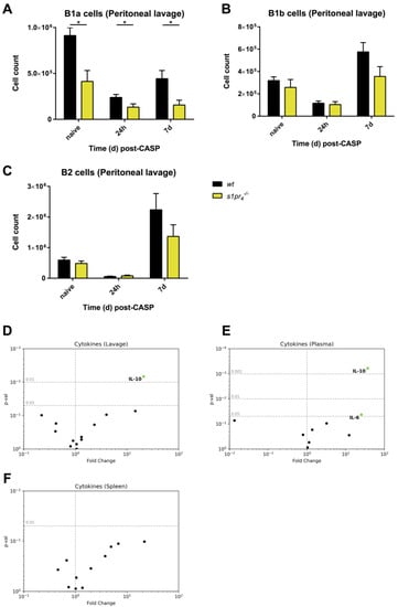 Influence of S1P4 expression on the composition of peritoneal B cell populations and cytokine levels in a murine model of polymicrobial abdominal sepsis. Polymicrobial abdominal sepsis was induced by colon ascendens stent peritonitis (CASP) in wt and s1pr4−/− mice. (A–C) The number of B1a (A), B1b (B), and B2 (C) B cells within the peritoneal lavage fluid of naive mice, 24 h and 7 days after induction of CASP. (D−F) Measurement of cytokines in the lavage (D), plasma (E), and spleen (F) 24 h after the induction of abdominal sepsis. The fold change of concentrations between wt and s1pr4−/− animals was calculated and plotted against the corresponding p-values (n = 10). Only cytokines that reached significance are labeled. * p < 0.05.