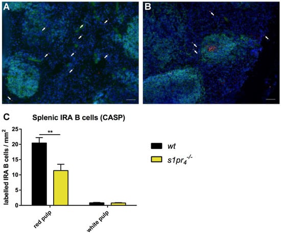 Quantification of IRA B cells in the spleen after CASP. Seven days after sepsis induction by colon ascendens stent peritonitis (CASP), the number and localization of splenic IRA B cells in wt (A) and s1pr4−/− (B) mice were analyzed. Splenic tissue sections were stained with anti-B220 (green), anti-GM-CSF (red), and DAPI (blue). IRA B cells were identified as B220+ GM-CSF+ cells and are marked with white arrows (white bars equal 50 µm). (C) The number of IRA B cells was compared between wt and s1pr4−/− animals for both splenic compartments. Bars depict the mean values (+SEM) of IRA B cell counts (n = 6) (white scale bar equals 50 µm). ** p < 0.01.