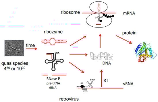 DNA could also have been produced without proteins by chemical deoxygenation of RNA. Thus, the transition from the RNA to the DNA and protein world may have taken place before the protein enzyme evolved, which catalyzes this conversion, the reverse transcriptase (RT) [3]. The reverse transcription of RNA into DNA is the essential step in retroviral replication from RNA to DNA and coined the name of the virus, the retroviruses. Yet, the RT is of much more general importance for the mobility of retrotransposons, the elongation of telomeres, and others [48]. Protein enzymes accelerated reactions compared to RNA enzymes, and thereby were able to speed up evolution.