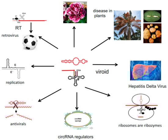 - Symons, R.H. Plant pathogenic RNAs and RNA catalysis. Nucleic Acids Res. 1997, 25, 2683–2689. [Google Scholar] [CrossRef] [PubMed]