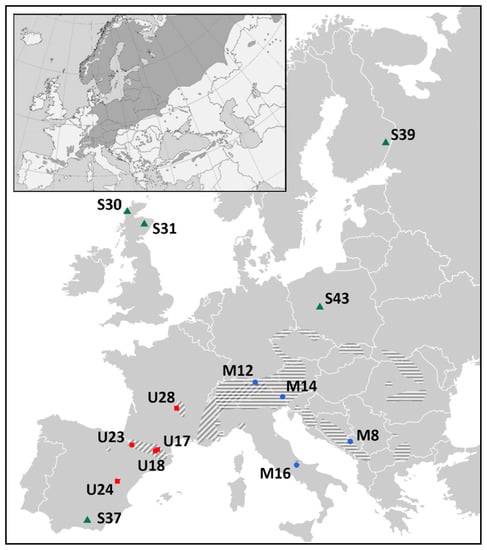 Localization of 14 studied populations with indication of species distributions. Dwarf pine—blue dots and horizontal shading, Pyrenean pine—red squares and diagonal shading, Scots pine—green triangles and dark shading on attached miniature presenting species’ European range. The mountain pines’ distribution map was created by the authors based on the Empty Political Map of Europe iso3166-1, downloaded from Wikimedia Commons (https://commons.wikimedia.org, accessed 4 October 2018; []), and the information on species’ ranges taken from []. The Scots pines’ distribution map has been obtained by courtesy of the EUFORGEN (EUFORGEN 2009, www.euforgen.org, accessed 22 September 2009; []), and adapted.