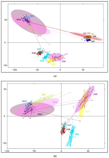 Among clustering analyses, two multivariate methods were implemented. To determine how our SNPs discriminate populations of studied taxa, principal coordinate analysis (PCoA) was conducted, and principal component analysis (PCA) was subsequently employed to characterize variation within populations and to elucidate individual genotypes. In comparison between all 14 investigated populations, the three first axes of PCoA explained 58.8%, 12.6%, and 5.7% of the original variation, respectively, while in PCA, considering variation among individuals, these values decreased to 12.3%, 3.5%, and 2.0% (Figure 2a and Supplementary Figure S3a), confirming that a greater part of the diversity segregates within populations. These results confirm the distinction of three gene pools correlating with the studied species. Generally, horizontal axes separated dwarf pine from Scots pine, and Pyrenean pine was distant from them along the second axis, remaining somewhat closer to the other mountain taxon. The PCA plot (Figure 2a) exhibited greater variability within species and populations and facilitated the identification of some outlier samples. Five individuals grouped with populations of other species, indicating their putative hybrid origin, or less likely, mixture of the samples. In multivariate inquiries focused on two mountain pines, PCA axes accounted for 6.6%, 3.4%, and 2% of variation (Figure 2b), and in PCoA, they explained 44.5%, 16.0%, and 11.6% of diversity (Supplementary Figure S3b), in both cases distinguishing first between taxa, then between Pyrenean pine stands (U17, U18, and U23 vs. U24 and U28). The second axis also demonstrated only slight distinction of the dwarf pine stand M8 in the Dinaric Alps from the rest of its populations; however, 95% confidence intervals of the dwarf pine populations remained overlapping.