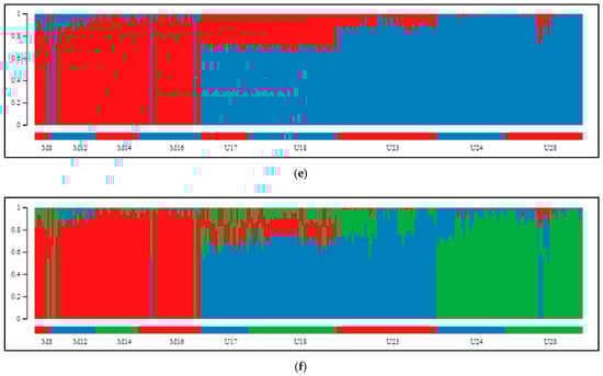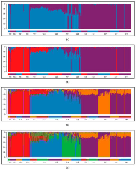 - Pritchard, J.K.; Stephens, M.; Donnelly, P. Inference of population structure using multilocus genotype data. Genetics 2000, 155, 945–959. [Google Scholar] [PubMed]
