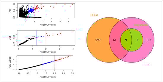 Outlier SNPs detected by three methods in comparison between populations of dwarf and Pyrenean pine. Three panels on the left represent outlier markers (significant at p/q value ≤ 0.05—blue and red points, the first values in brackets, or p/q value ≤ 0.01—red points only, the second values in brackets) revealed by FDist (207/43; top), BayeScan (14/8; middle) and FLK (178/28; bottom) methods. The right panel with a Venn diagram shows how the results from the less stringent level of significance in the three analyses overlap. From the output of the FDist method, only SNPs with Fst above 0.02 were considered significant and are colored.