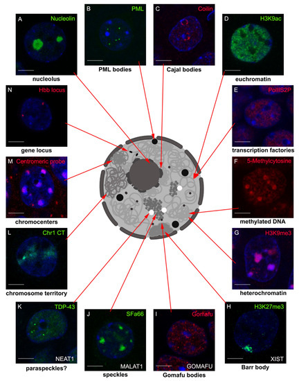 The cell nucleus is a highly organized organelle composed of many functional and structural domains (Figure 1). Silent chromatin is compacted in the form of dense chromocenters, localized at the nuclear periphery or adjacent to the nucleolus [1]. The active chromatin compartment faces the interchromatin domain in which nuclear bodies reside [2,3]. Nuclear bodies are membrane-less nuclear subcompartments that form via liquid–liquid phase separation. They are formed by various RNAs and proteins, which together conduct highly specialized processes. Examples include the nucleolus, speckles, paraspeckles, and Promyelocytic leukemia (PML) bodies [4], just to mention a few [5]. Importantly, nuclear architecture is dynamic and directly linked to transcriptional activity [6,7,8].