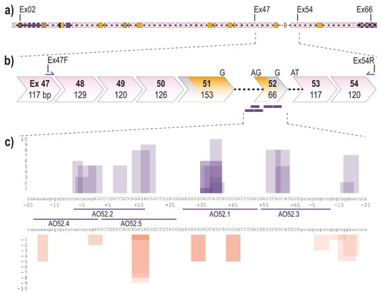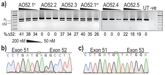 Analysis of PCR amplicons revealed the presence of two products in several samples; the expected full length (FL) product between exon 47 forward and exon 54 reverse primers, as well as a smaller product corresponding to the expected size after skipping of exon 52 (Δ52) (Figure 2a). The identity of the amplicons was confirmed by band purification and Sanger sequencing, confirming the precise removal of all 66 bases of exon 52 (Figure 2b,c).