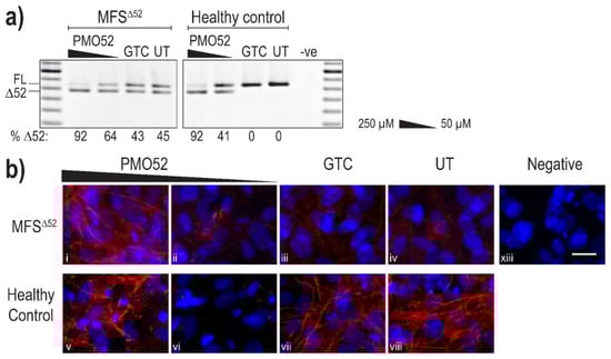 Evaluation of PMO52 in MFSΔ52 fibroblasts. Healthy control and MFSΔ52 patient fibroblasts were transfected with PMO52 (250 μM and 50 μM), GTC or left untreated. Cells were collected 4 days post-transfection. (a) RT-PCR analysis of FBN1 exons 47 to 54 amplicons showing full-length (FL, 859 bp) and exon 52-skipped (Δ52, 793 bp) transcripts. The relative abundance (%) of Δ52 amplicons are shown below each gel image. GTC: Gene Tools control PMO, UT: untreated control, -ve: RT-PCR negative control, 100 bp molecular marker used as a size reference. The gels were cropped for presentation. Full gel images are presented in Figure S1 (b) Representative images showing fibrillin-1 (red) and nuclei (blue) in MFSΔ52 or healthy control fibroblasts treated with (i,v) 250 µM of PMO52, (ii,vi) 50 µM of PMO52, (iii,vii) 250 µM of GTC or (iv,viii) left untreated. (xiii) negative control with no primary antibody added. Scale bar = 20 µm. The images were cropped for presentation. Full images are presented in Figure S3.